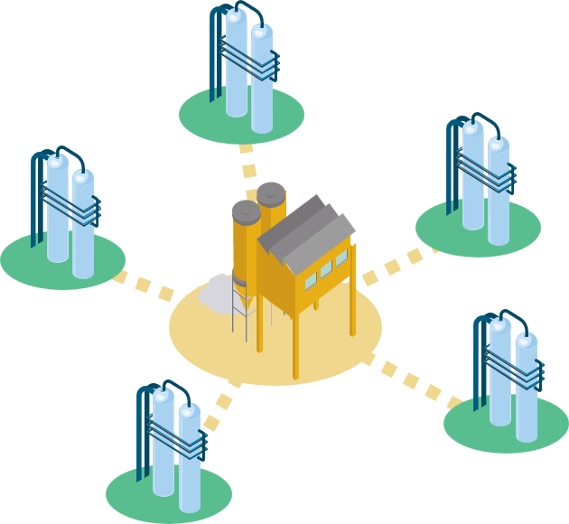 Our decentralized approach to CO2 storage envisions reacting CO2 emissions where they occur with locally available industrial wastes. The technology can be deployed directly next to emission sources such as CHP or biogas plants.